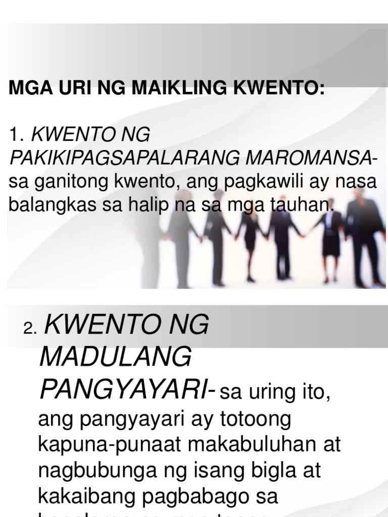 Nagpapakilala ng mabilis na pagtaas ng kawilihan hanggang sa kasukdulan na sinusundan kaagad ngwakas. Pages 56 This preview shows page 1 - 19 out of 56 pages. Isang salaysay ng isang mahalagang pangyayaring kinasasangkutan ng isa o ilang tauhan at may isang kakintalan o impresyon Pinakapopular sa mga mambabasa 1142016GinoongGood.