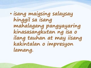 Ito ay isang akdang pampanitikang likha ng guniguni at bungang isip na hango sa isang tunay na pangyayari sa buhay. Mayroong mga salita na maaring maging Pang-uri at Pang-abay. Pang Uri At Pang Abay.
